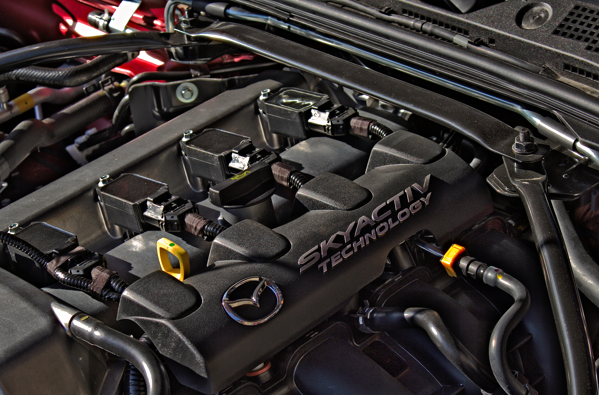 Die geschwungene Flanke, die für Ellenbogen-Tauglichkeit sorgt, die fetten Finnen, die Dir vom Cockpit aus als Fluchtpunkt gen Asphalt-Horizont dienen – das ist schön fokussiert, auf den Fahrer ausgerichtet. In keinem anderen Mazda-Modell passt Jinba Ittai besser – die Philosophie der Ross-und-Reiter-Einheit.