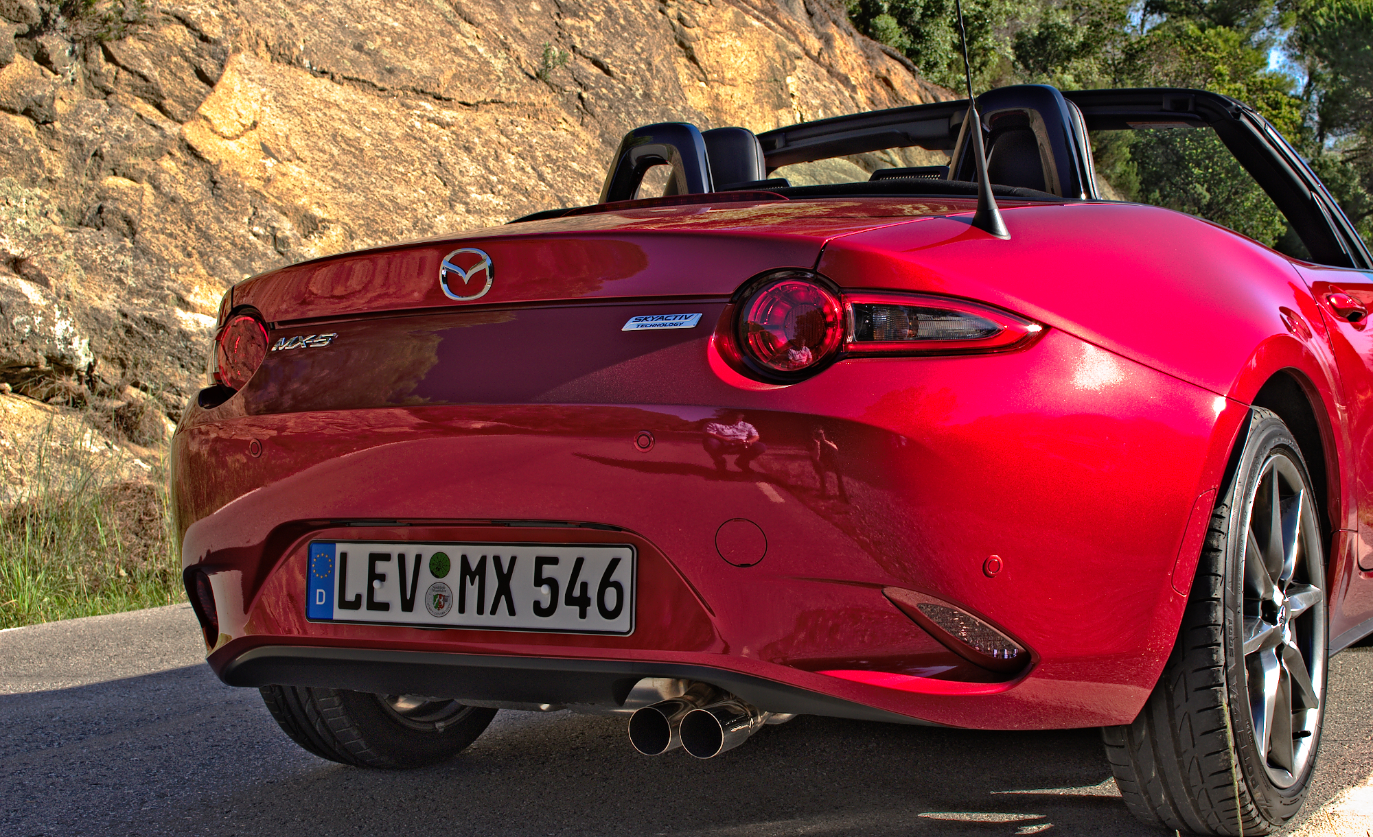 2015 Mazda MX-5 Miata Eunos ND 2.0 SKYACTIV-G 160 i-ELOOP Rubinrot-Metallic Heckansicht AusschnittMario von Berg am 28. Juli 201628. Juli 2016 von Mario Lehmann